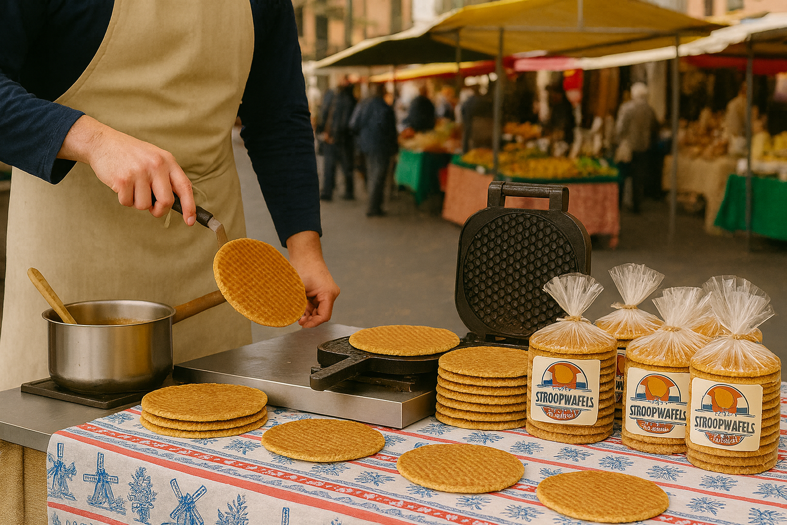 Het onweerstaanbare aroma van vers gebakken stroopwafels nodigt je uit om dichterbij te komen.